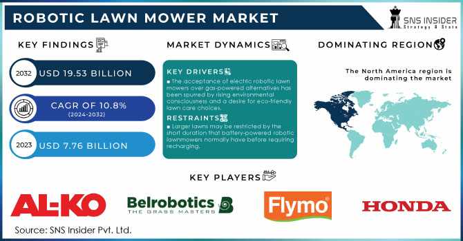 The Robotic Lawn Mower Market size was estimated at USD 7.76 billion in 2023 and is expected to reach USD 19.53 billion by 2032 at a CAGR of 10.8% during the forecast period of 2024-2032.